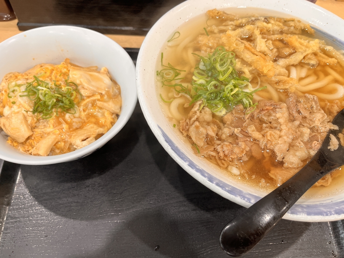 親子丼と肉ごぼううどん(トリプル)セットを食う。